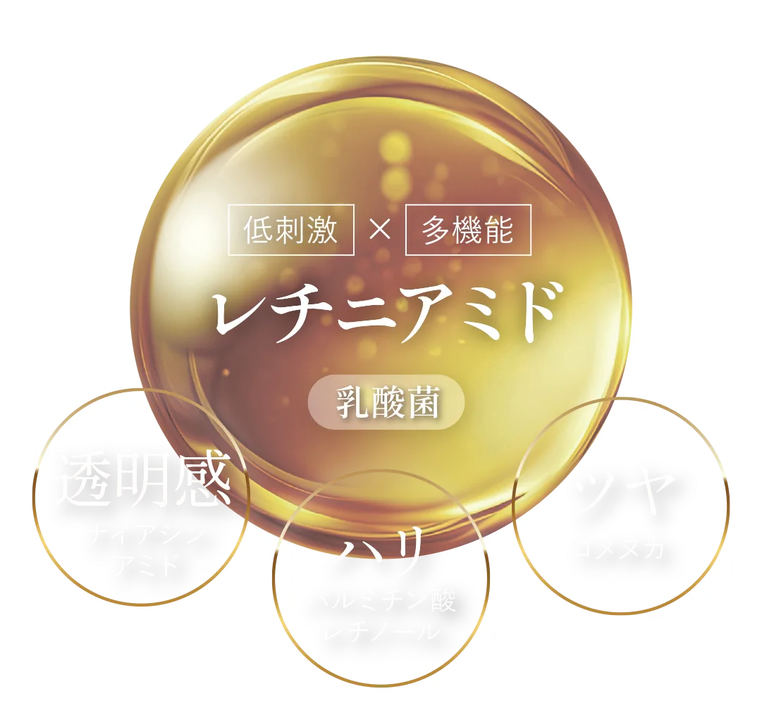 注目の美容成分「ナイアシンアミド」「パルミチン酸レチノール」「コメヌカ」の3つを組み合せ、乳酸菌と発酵・凝縮させたことでパワフルな手応えと低刺激を実現したレチニアミドを70%配合した美容ジェル。